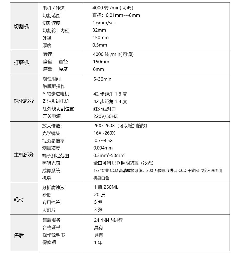 线束截面分析仪一体型端子切割和研磨台:通过专用的线束夹具将端子夹好以后,切割盘与研盘独立控制(采用双电机),X 轴与 Z 轴传动使用目前市场最高标准日本米思米滚珠丝杆及米思米超高精度滑轨传动,X 轴与 Y 轴控制使用日本松下伺服马达控制,充分超越了手动旋转手轮控制行程。可以为客户准确的打磨端子的高度控制。端子切割和研磨抛光所需要的时间为 1~2 分钟。 超过AWG38 极细线也能鲜明地显示出。 用最新开发的断面评价专用软件,可测定 端子高度、宽度、高宽比率、端子压接面积、线束压接面积、压缩比率、毛刺高、宽,毛刺率压接翼之间距离、与底部之间距离、孔隙率等项目,现在市场最高标准、完全超越汽车、家电、铁路轨道列车、IT 等行业标准。能瞬时导出报告并自动判断所有项目是否合格。 在最大倍率下的测量精度为 2 ~ 3µm。
