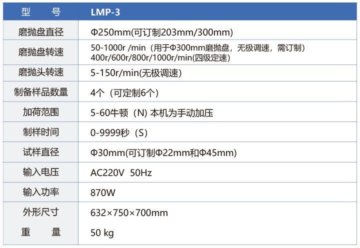 LMP-3系列 全自动磨抛机,依据国际标准的先进工艺技术制造的新一代高效高精度自动化研磨抛光设备。磨抛盘旋转方向可任意选择、抛磨片快拆设计,多试样夹试器和气动单点加载等功能。先进的微处理器控制系统,使得磨抛盘、磨抛头的转速实现无级可调,制样压力以及时间设定直观便捷。机身采用铸铝底座增加了磨抛的刚性等特点。玻璃钢外壳以及不锈钢标准件的使用,在外观上更加美观大方,并提高了防腐防锈性能且易清洁。适用于对金相试样的粗磨、精磨、粗抛光至精抛光过程进行自动制样。是企业、科研单位以及大专院校实验室的理想制样设备。