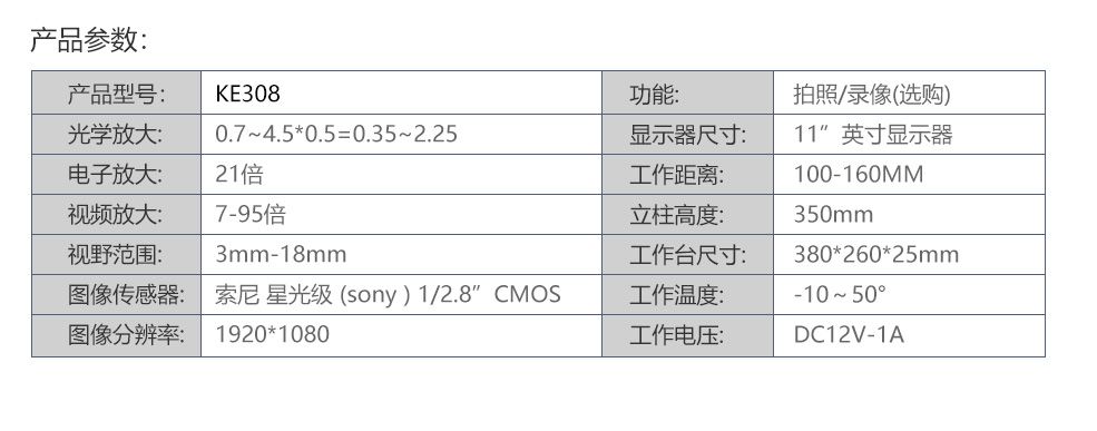 全新一代KE308视频kaiyun.开云电子,采用索尼 星光级CMOS芯片,分辨率1920*1080具有超低噪度,色彩还原好的特点,全新图像编码技术将画质在原有基础上得到3倍提升,搭配专用10英寸高清显示屏。是最具性价比的高清视频kaiyun.开云电子,产品放大10~100倍,视野3~15毫米,适用于电子工程、五金塑胶、印刷、纺织、FPC等品质检测使。