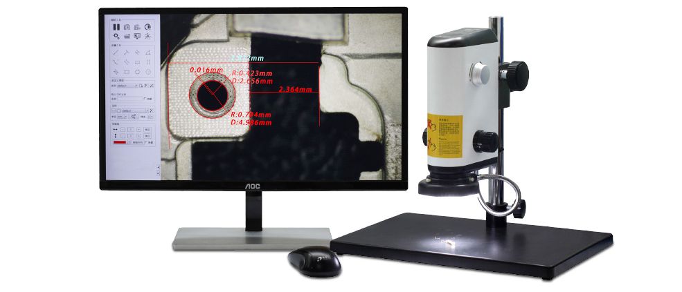 具备点间距、线间距、直径,半径,圆心距、角度、矩形、多边形等多种测量功能,解析度 0.001 毫米,并可将带有测量结果的图像内容通过 U 盘存储方式进行存储与拷贝。