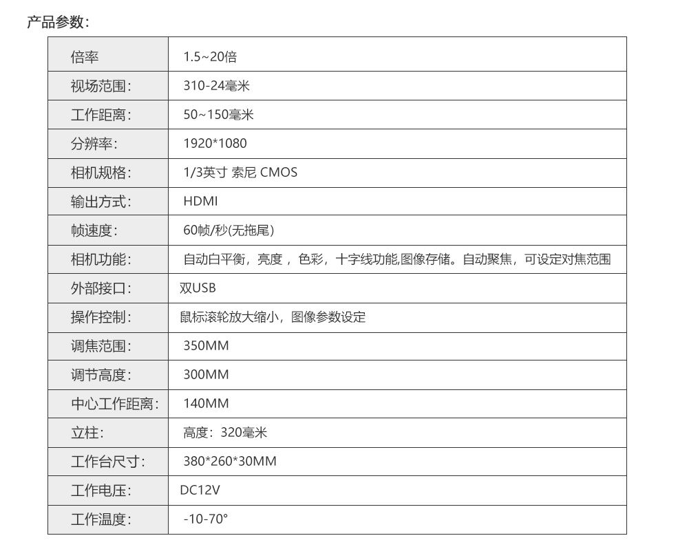 本产品采用高清HDMI视频信号,自动曝光、自动白平衡、自动调整饱和度、自动宽动态。并具备图像存储、视频录像、参考判定等功能。友好的IU菜单界面控制,通过鼠标可以完成所有操作。产品广泛应用于工业检测,医学观察,科学科研,自动化系统等领域。